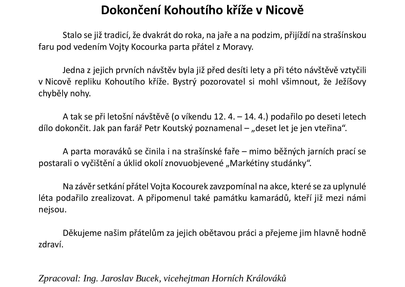 Dokončení Kohoutího kříže v Nicově