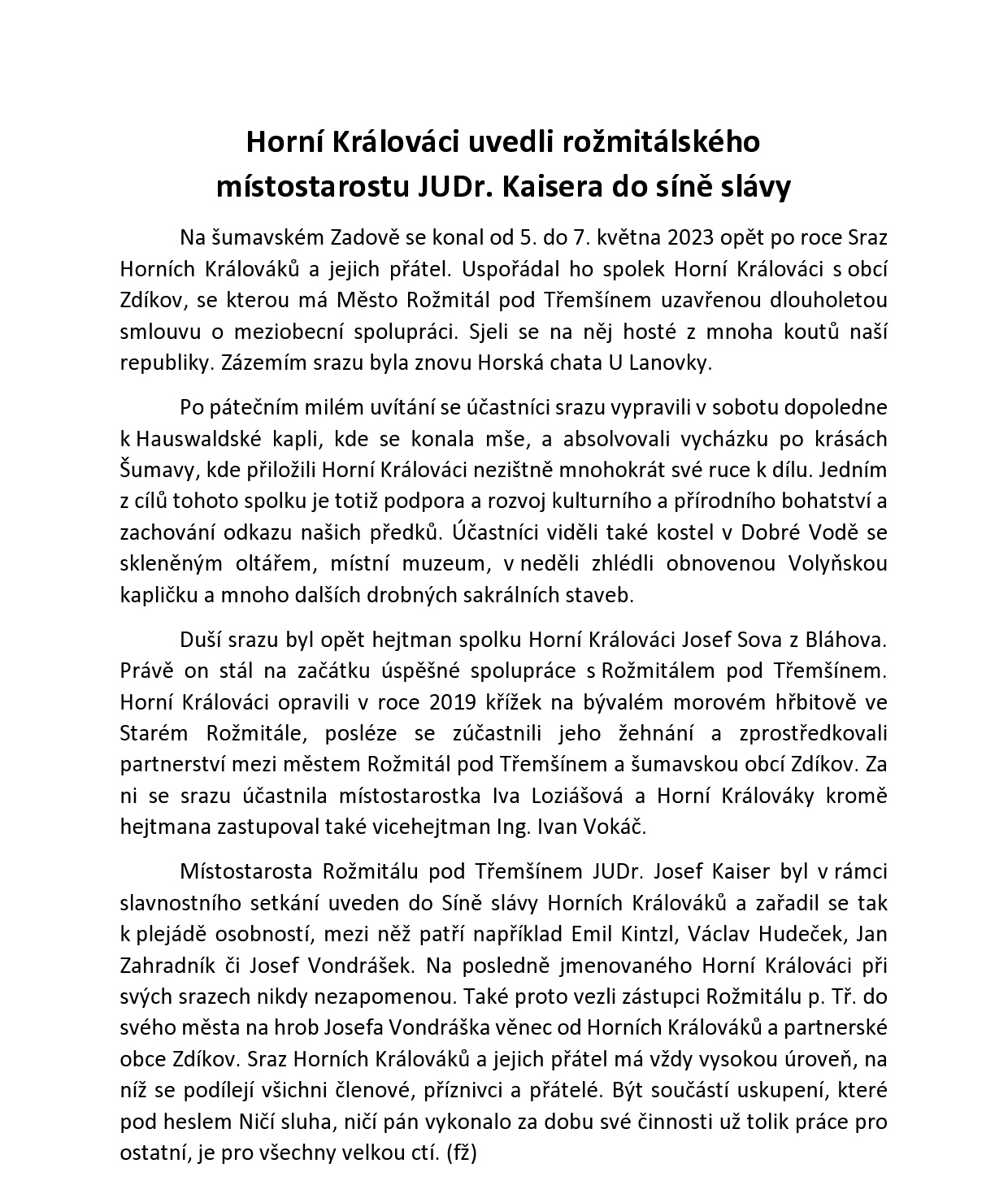 Úvodní stránkaHorní Králováci uvedli rožmitálského místostarostu JUDr. Kaisera do síně slávy Horní Králováci uvedli rožmitálského místostarostu JUDr. Kaisera do síně slávy