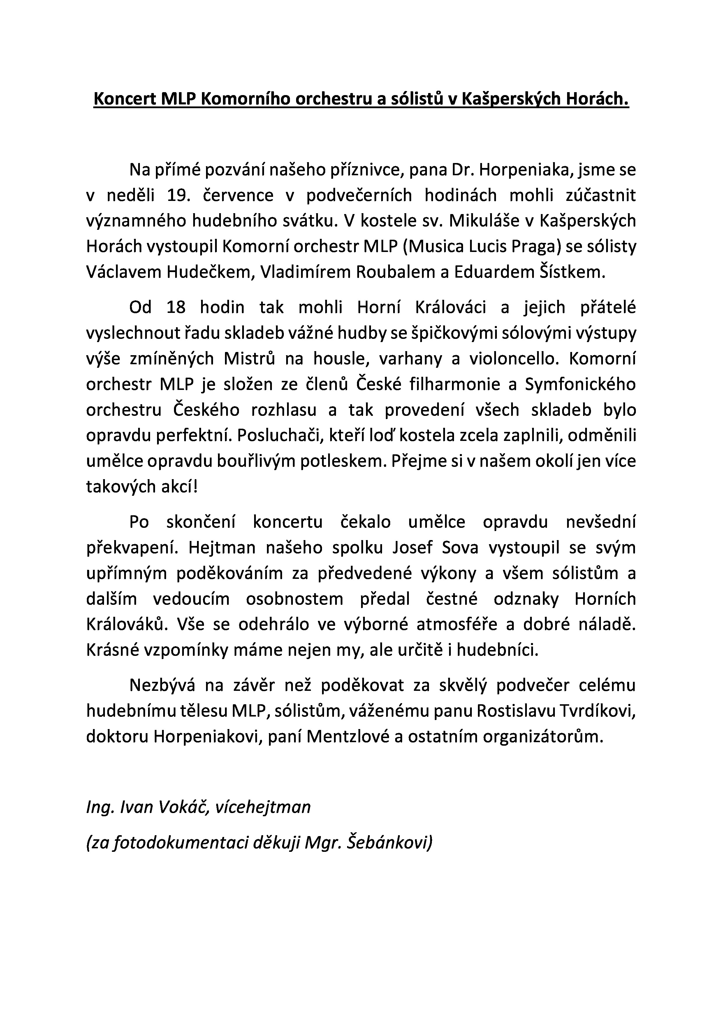 První účastníci koncertu se scházejíPřichází i hejtman Horních Králováků Josef Sova Část hudebního tělesaMistr Václav HudečekMistr Eduard ŠístekHejtman Sova děkuje umělcům i skvělým pořadatelům. Předání odznaků pánům Tvrdíkovi, Roubalovi a ŠístkoviVáclav Hudeček byl nejprve dekorováním překvapen …… pak se ale dobře bavil.Program koncertu v Kašperských Horách s podpisy všech sólistů a hlavního pořadateleByl to vskutku mimořádný zážitek. Za Horní Králováky děkuje všem Josef Sova, hejtman