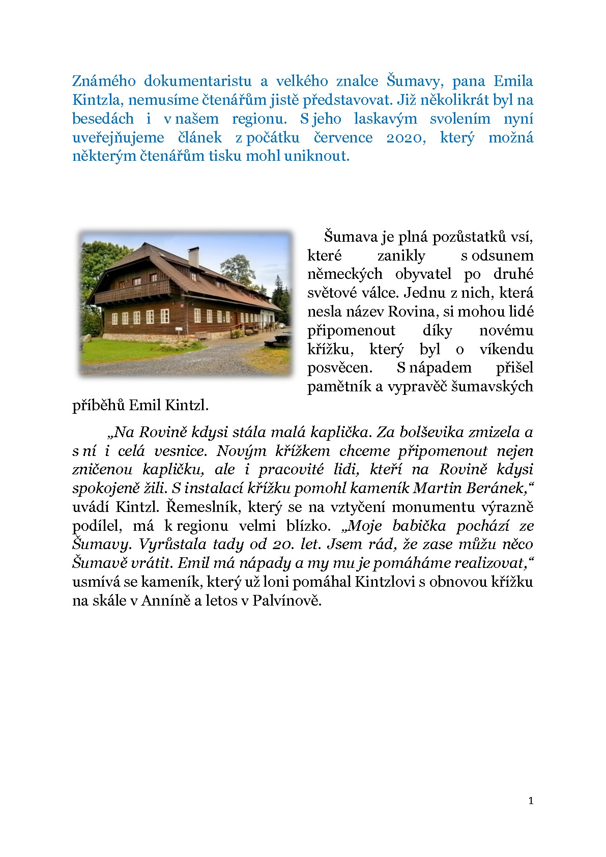 Úvodní stránkaNový křížek na Rovině z iniciativy E. Kintzla Nový křížek na Rovině z iniciativy E. Kintzla