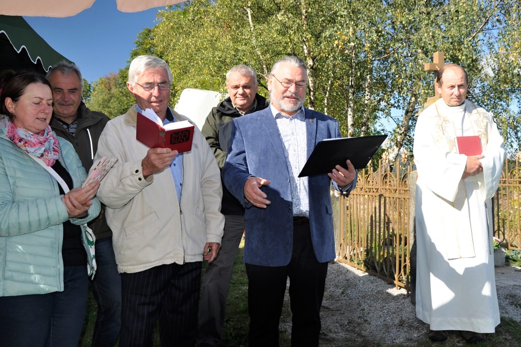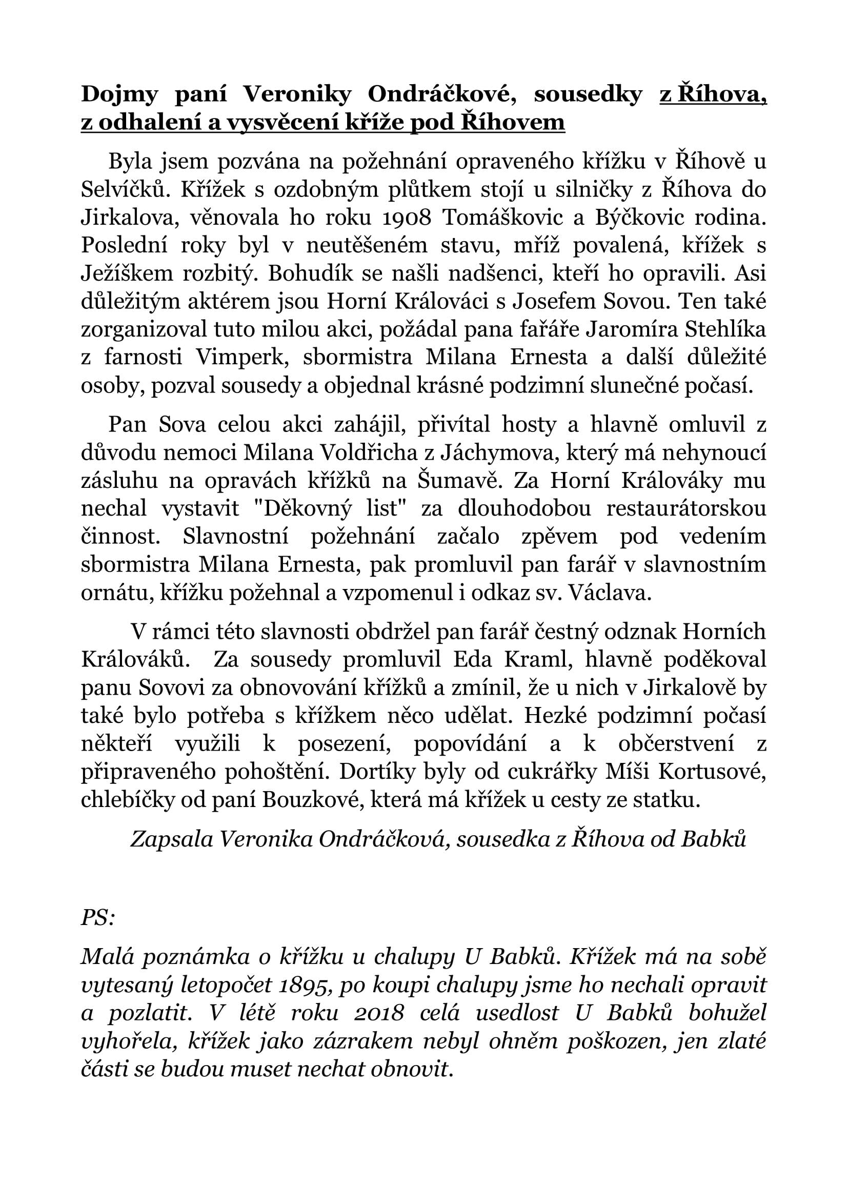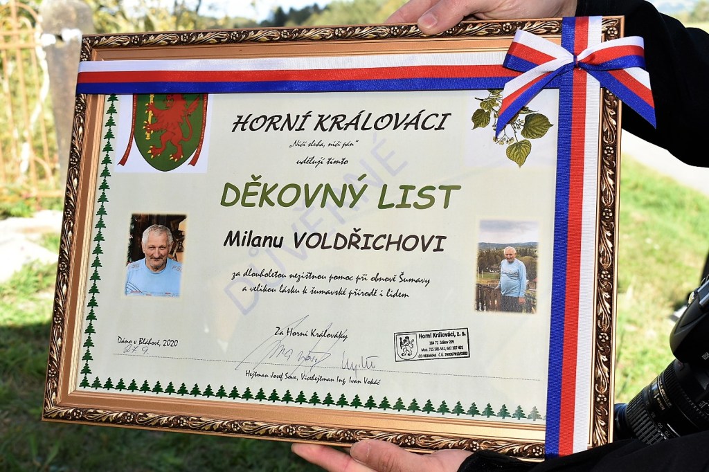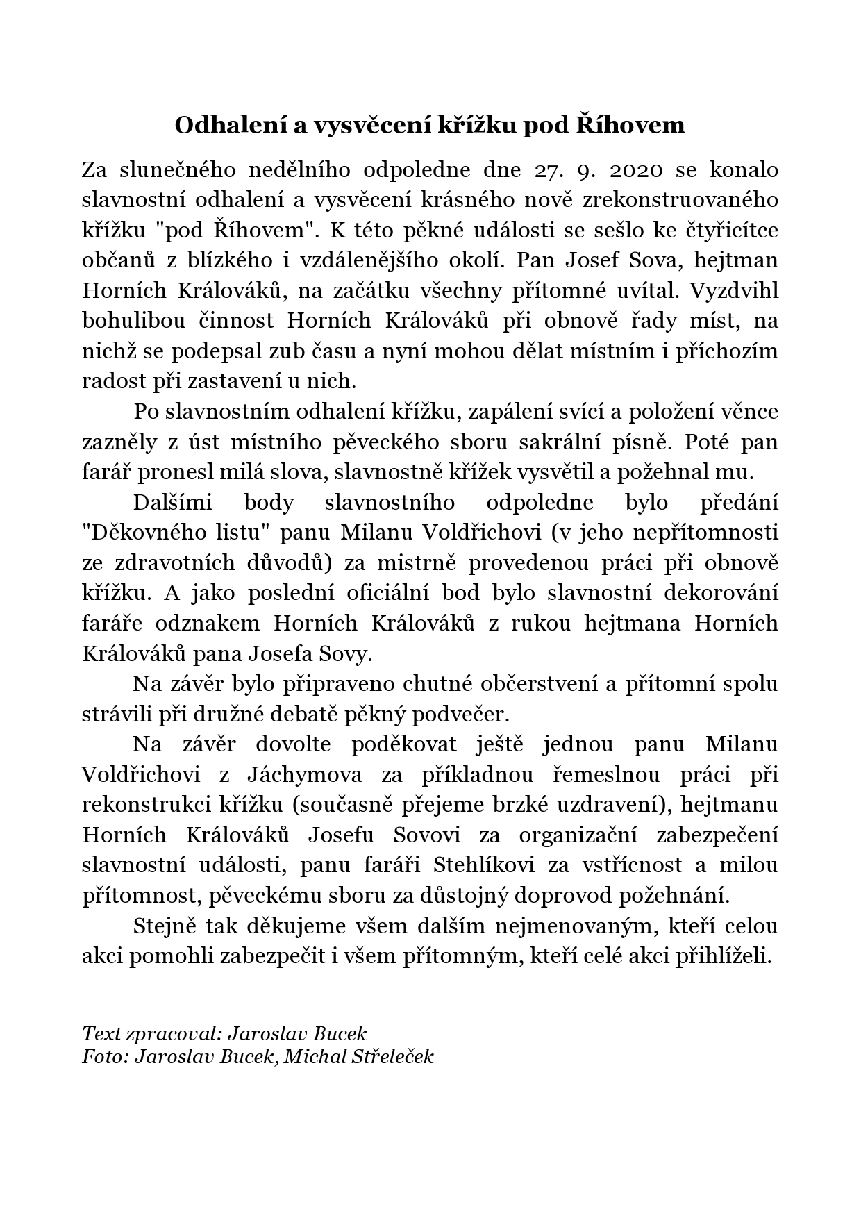 Vše připraveno k slavnostnímu aktuHejtman Horních Králováků při úvodním uvítáníK důstojnému aktu přispěl i pěvecký sborUvedené písně dotvořily slavnostní atmosféruPožehnání křížku páterem StehlíkemSlovům pátera Stehlíka bylo pozorně naslouchánoProstá nádhera křížkuDěkovný list panu Milanu VoldřichoviVšichni účastníci přispěli svou dobrou náladou