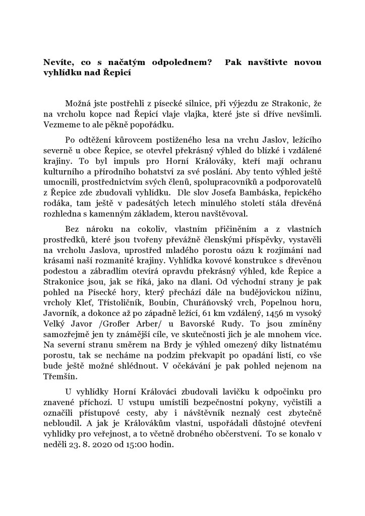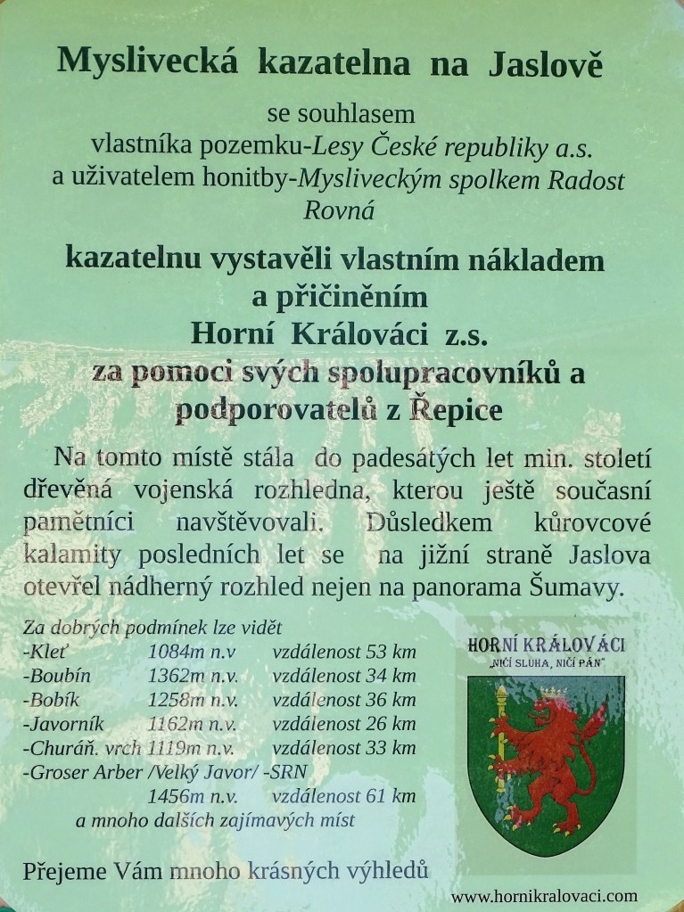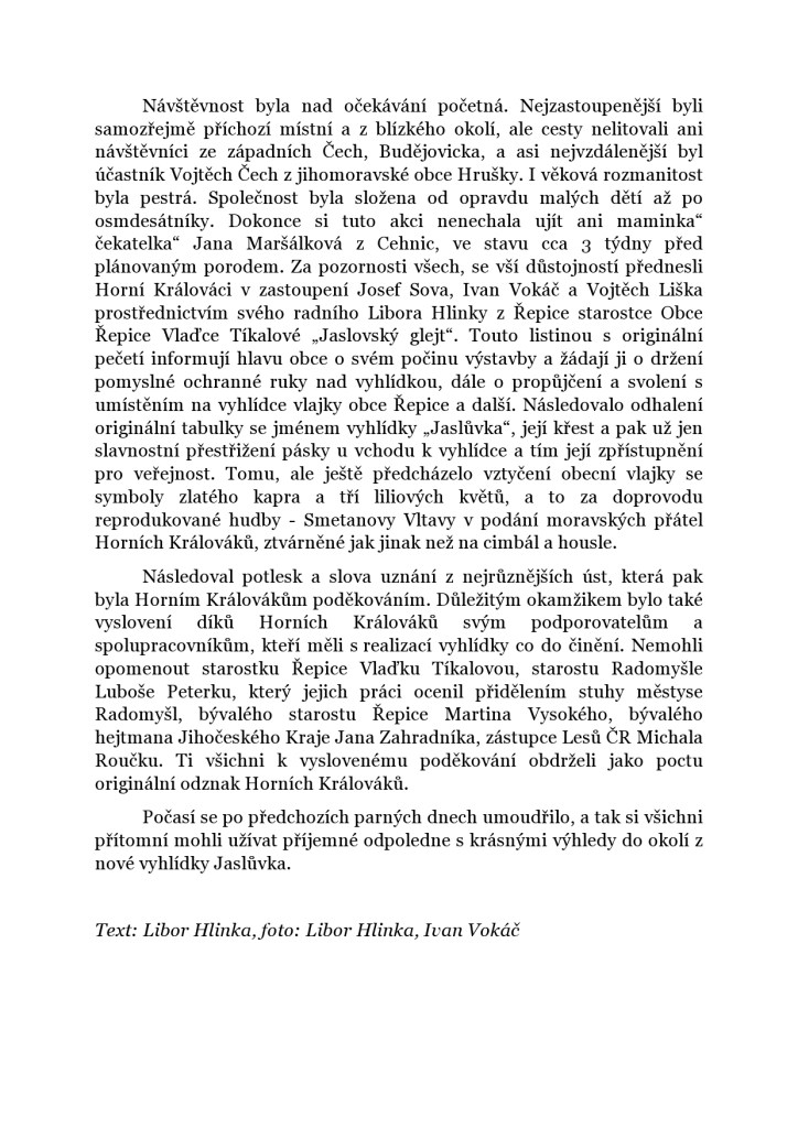 Vyhlídka JaslůvkaSpolečná fotografie účastníků slavnostního otevřeníJaslůvka s návštěvníkyInformační tabulka u vyhlídky JaslůvkaPánové Sova, Liška, paní Tíkalová a pánové Peterka a Hlinka při zahájeníOtevření vyhlídky se zúčastnil i exhejtman Ing. Jan ZahradníkPanové Sova, Peterka a manželé ZahradníkoviVýhled z vyhlídky na Strakonicko