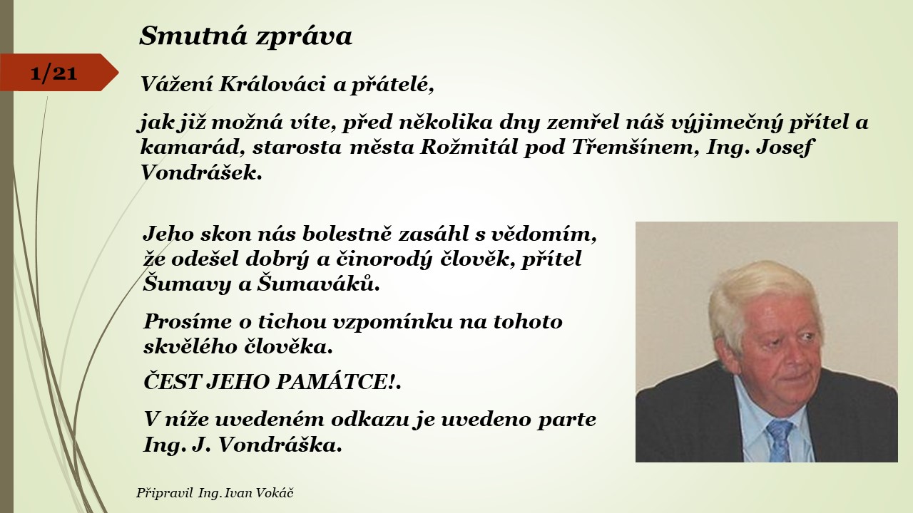Úvodní stránkaParte Ing. J. Vondráška Parte Ing. J. Vondráška Parte Ing. Josefa Vondráška shlédnete kliknutím ZDE