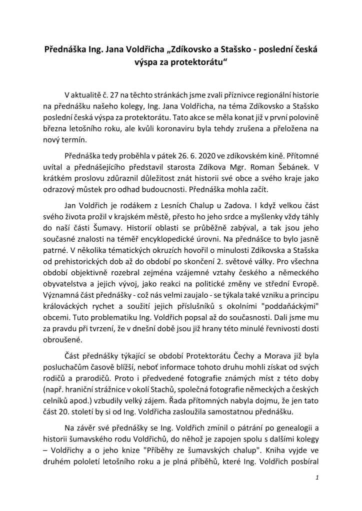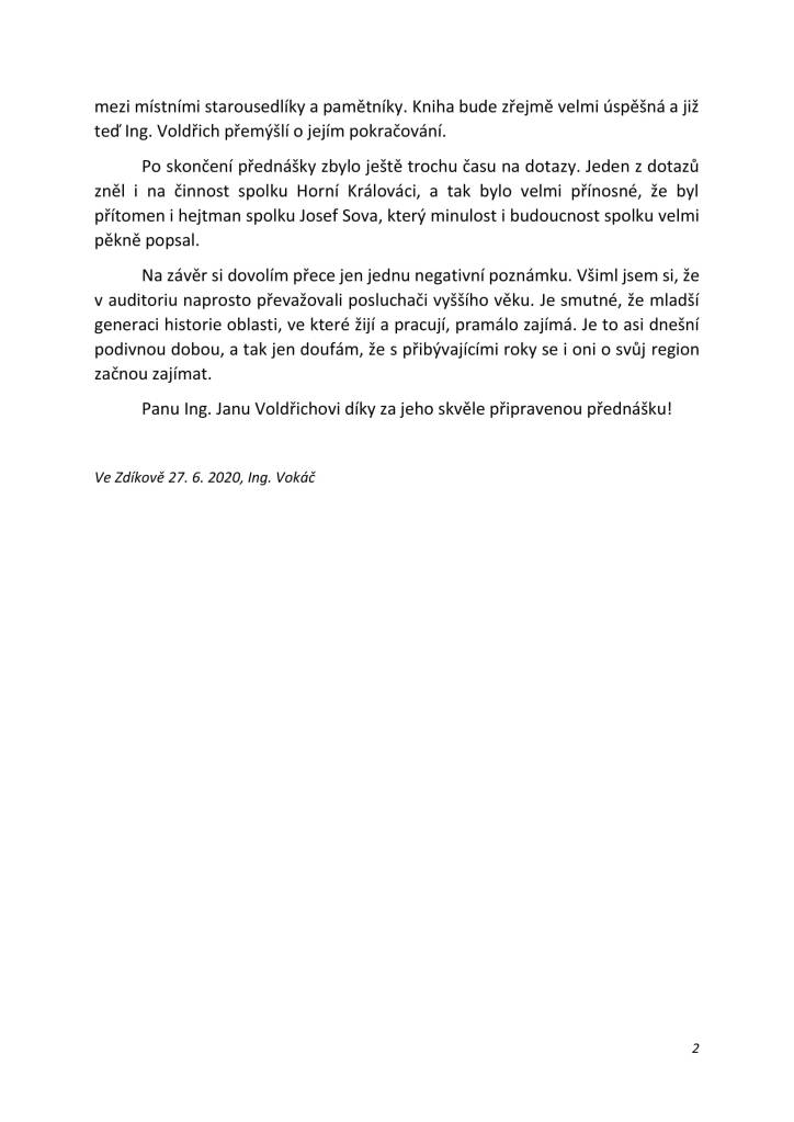 Mgr. Šebánek s Janem Voldřichem dolaďují promítací technikuDiskuze před zahájením přednášky Přednášku zahájil a přednášejícího představil starosta Zdíkova Mgr. ŠebánekZ přednáškyPozorní posluchači přednáškyJan Voldřich anoncoval svou knihu, která vyjde v říjnu 2020 – pracovní verze titulní strany knihy
