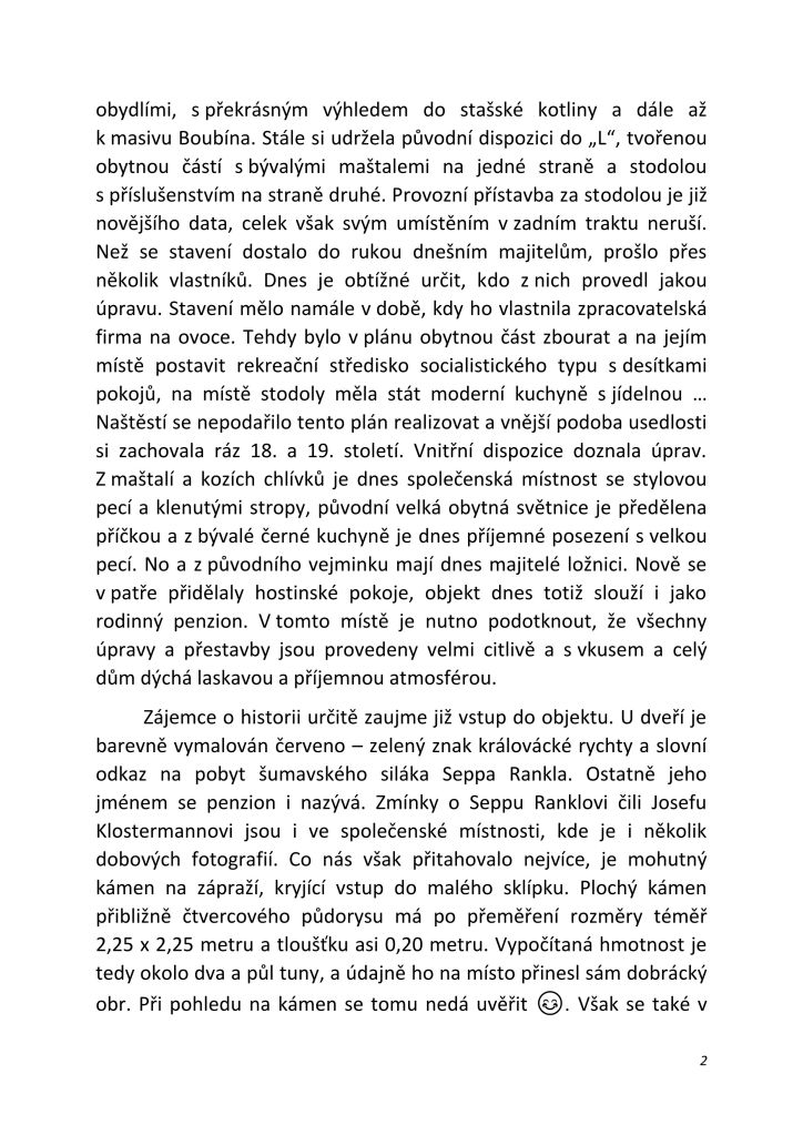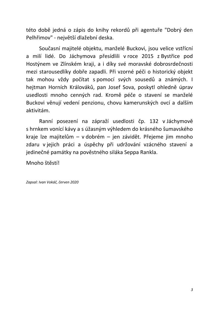 Úvodní stránkaRankl Sepp (6) Rankl Sepp (6) Usedlost v Jáchymově č. p. 132 Označení vstupu do domu Současní majitelé usedlosti manželé Buckovi Na svoje historické stavení jsou velmi hrdí Stavení si zachovalo téměř původní polohu Kámen, o kterém se zmiňuje pověst