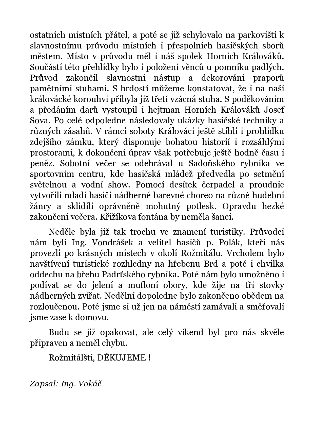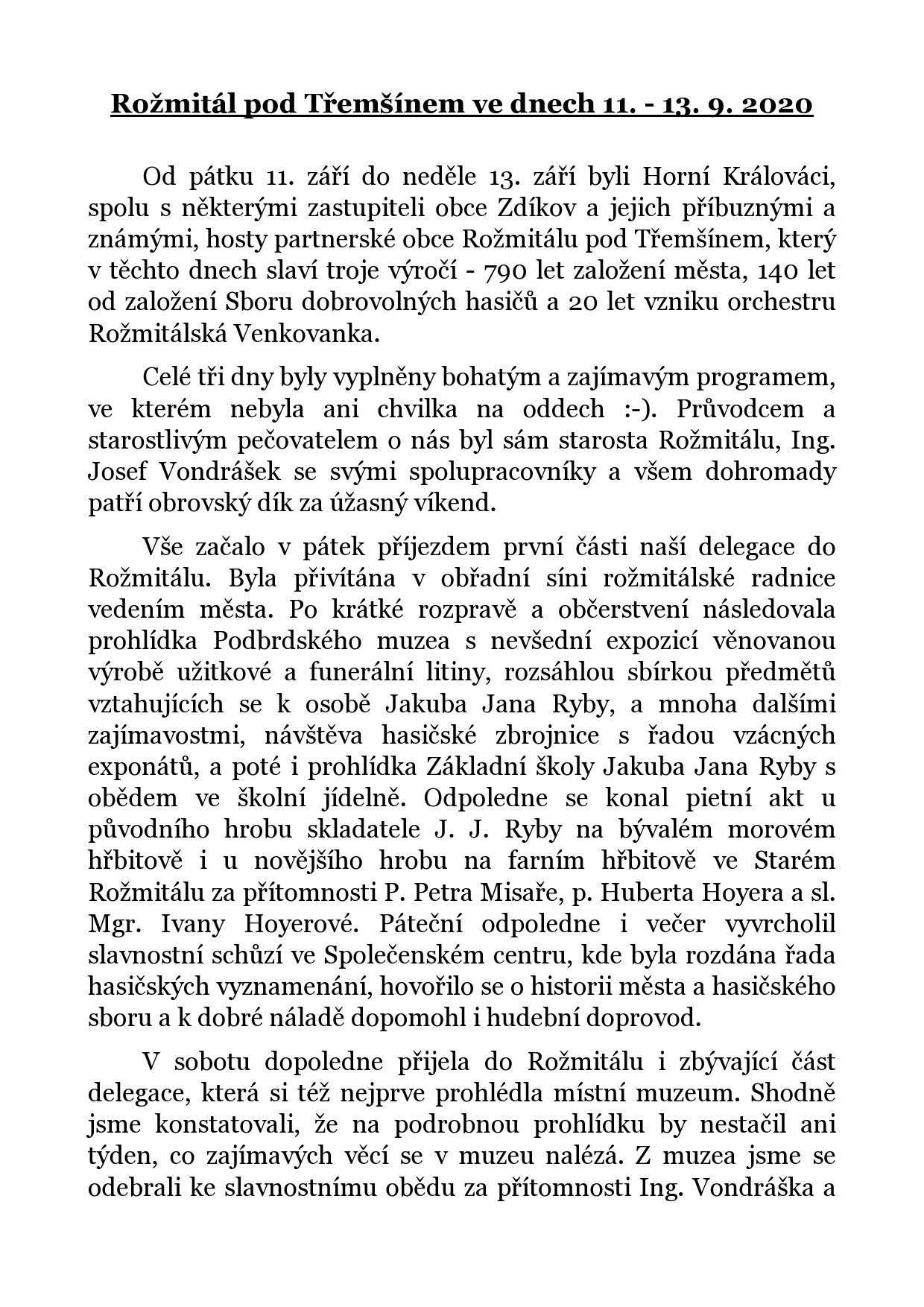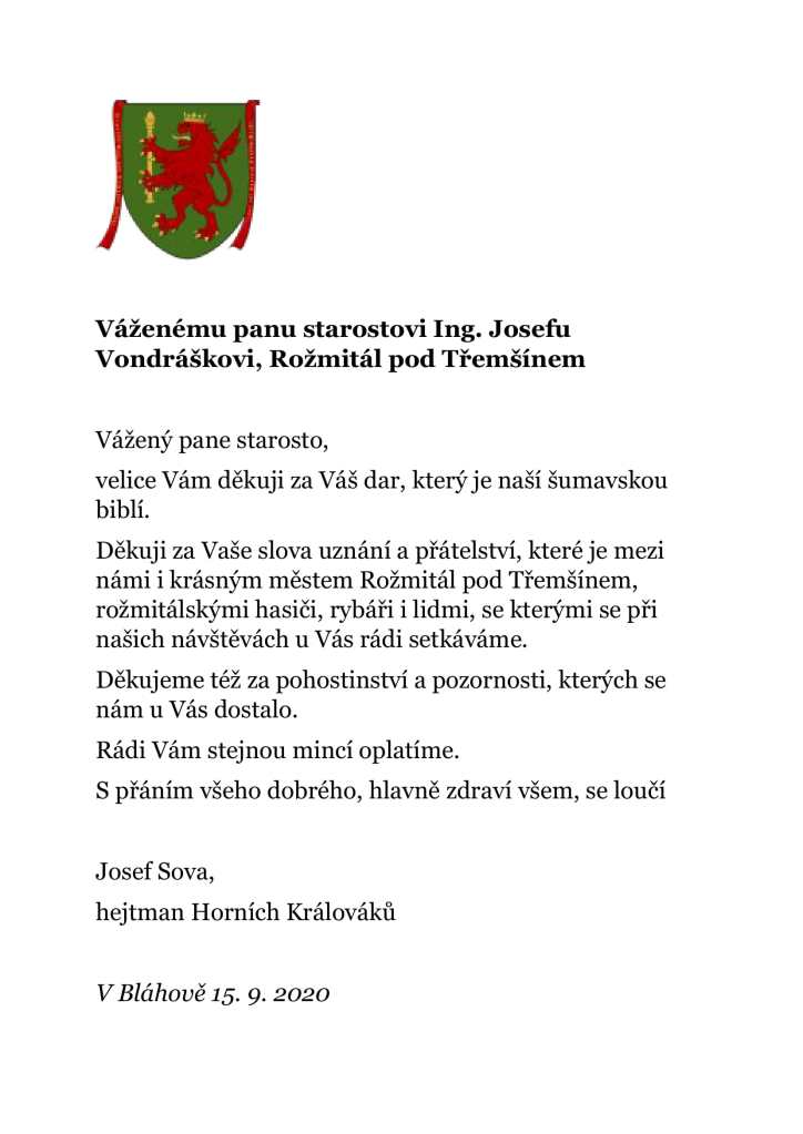 Přijetí delegace u starosty Rožmitálu pod Třemšínem Ing. Josefa VondráškaZ návštěvy v Podbrdském muzeuProhlídka školních učeben v ZŠ Jakuba Jana RybyKrálováci (zleva) Hlinka a Sova, regenschori p. Hoyer, Královák Voldřich, P. Petr Misař a sl. Mgr. Hoyerová při uctění památky Jakuba Jana RybyVěnec Horních Králováků položený u původního hrobu Jakuba Jana RybyHejtman Sova předává slavnostní dar starostovi Rožmitálu Ing. VondráškoviDekorování královácké korouhve slavnostní stuhouZ návštěvy rožmitálského zámkuSvětelná a vodní fantazie v podání mladých hasičůZ návštěvy turistické rozhlednyV jelení a mufloní obořeDar starosty města Rožmitál pod Třemšínem Ing. Josefa Vondráška hejtmanovi Horních Králováků Josefu SovoviOdpověď hejtmana Horních Králováků Josefa Sovy starostovi Rožmitálu pod Třemšínem Ing. Josefu Vondráškovi