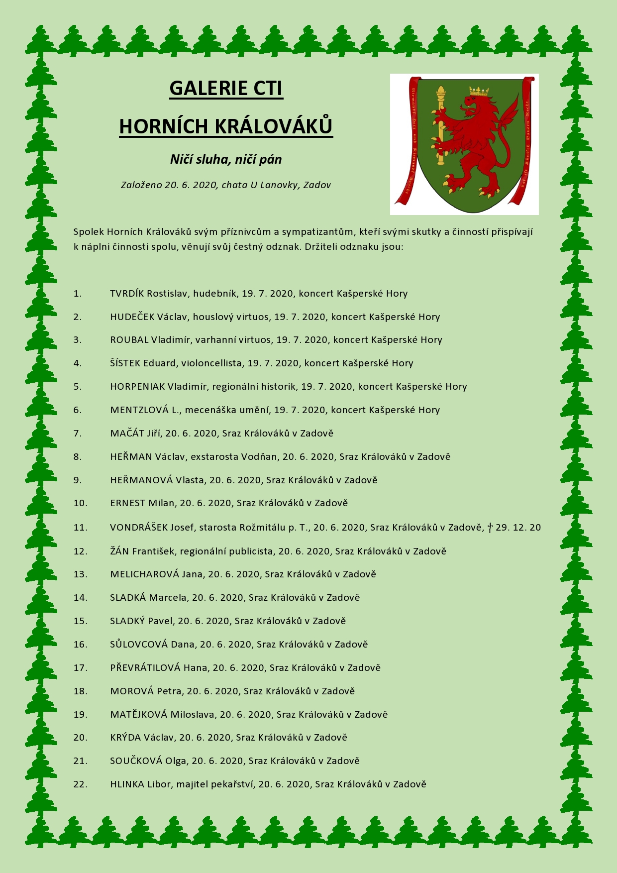 Spolek Horních Králováků svým příznivcům a sympatizantům, kteří svými skutky a činností přispívají k náplni činnosti spolu, věnují svůj čestný odznak. Níže je uveden seznam držitelů čestných odznaků spolku: