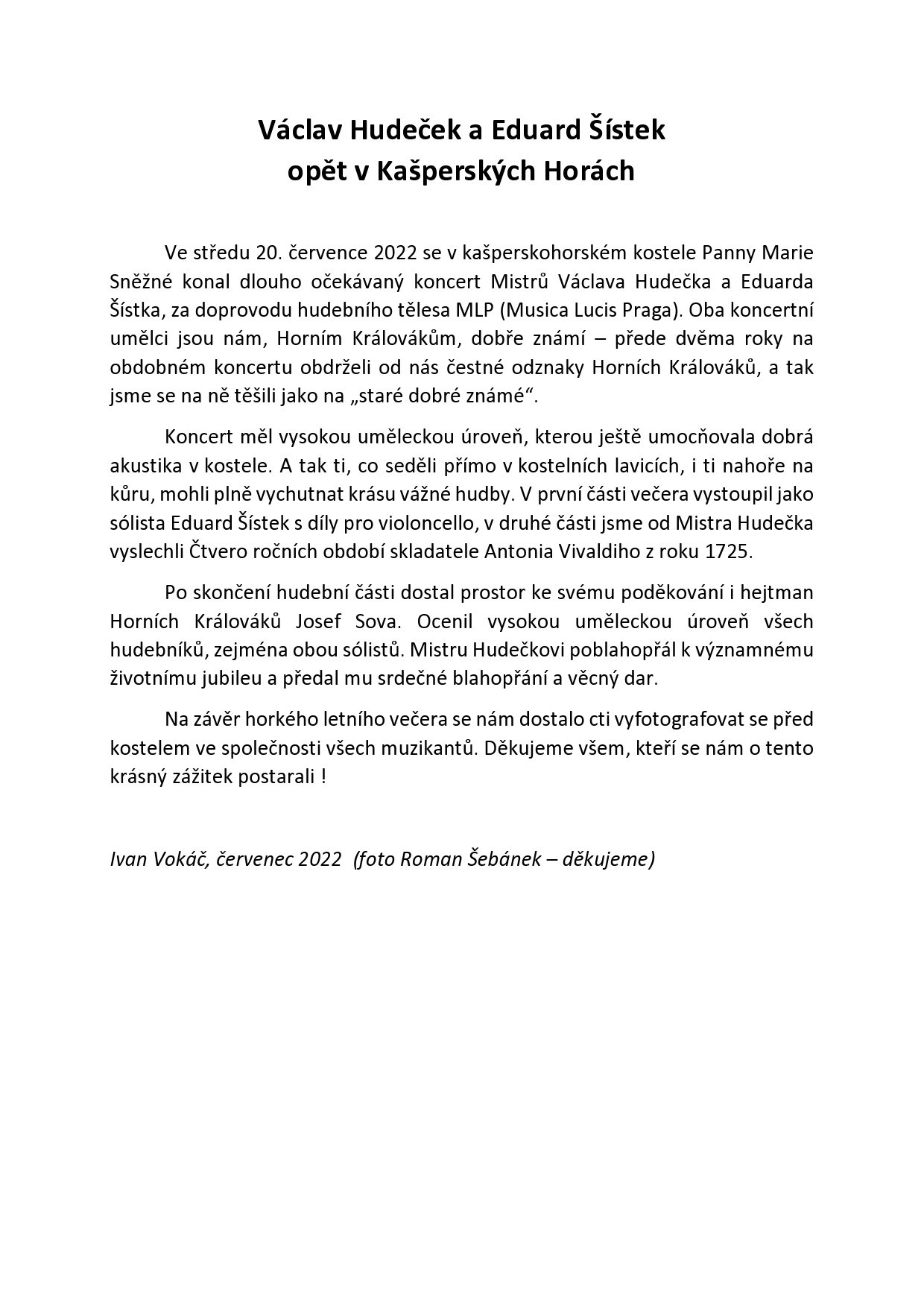 Úvodní stránkaVáclav Hudeček a Eduard Šístek opět v Kašperských Horách Václav Hudeček a Eduard Šístek opět v Kašperských Horách