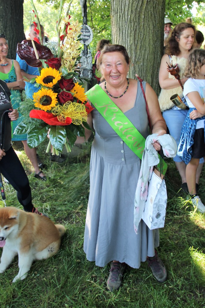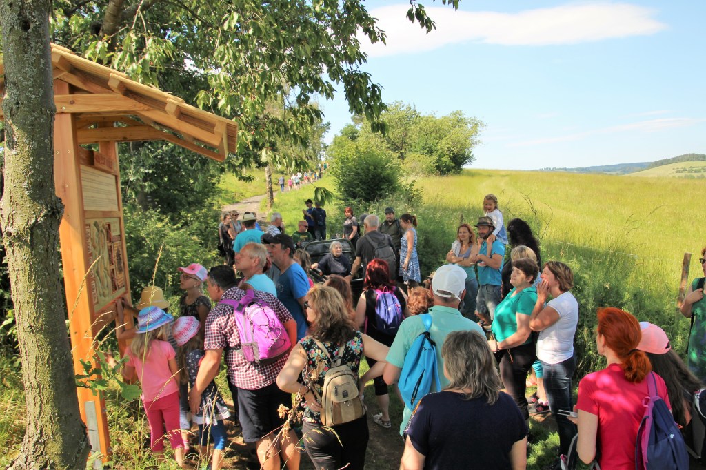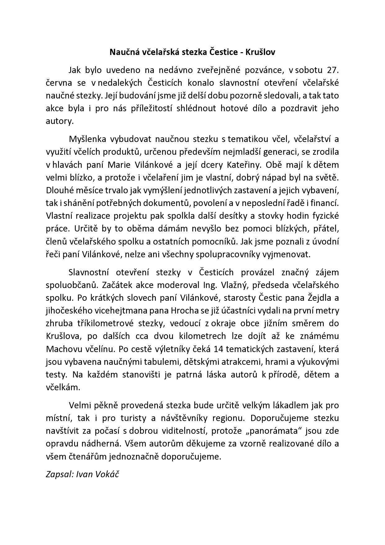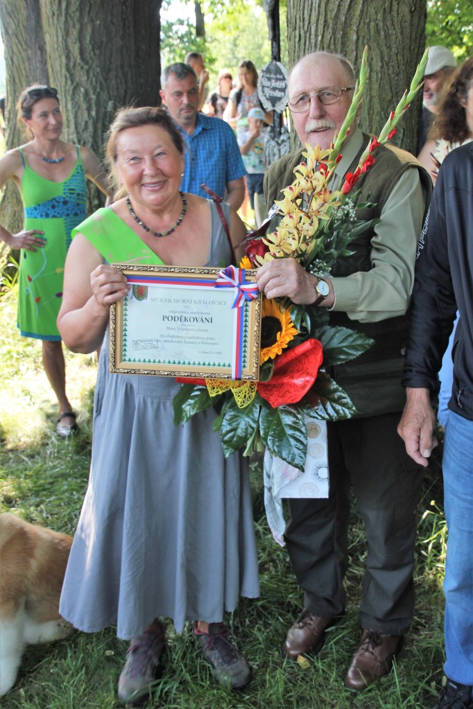 Paní Vilánková a pánové Vlažný, Žejdl a Hroch při úvodních proslovechNěkolik slov přidala i paní Kateřina Vršková, spoluautorka nápadu.Šťastná paní Vilánková se šerpou Včelařské královny od Horních KrálovákůHejtman Horních Králováků Josef Sova předává paní Vilánkové děkovný list.Akci doprovázel nebývalý zájem spoluobčanů.Jedno zastavení na trase se zajímavou skládankouNa stezce je řada atrakcí pro děti.Za příznivého počasí jsou ze stezky nádherné výhledy na všechny strany.