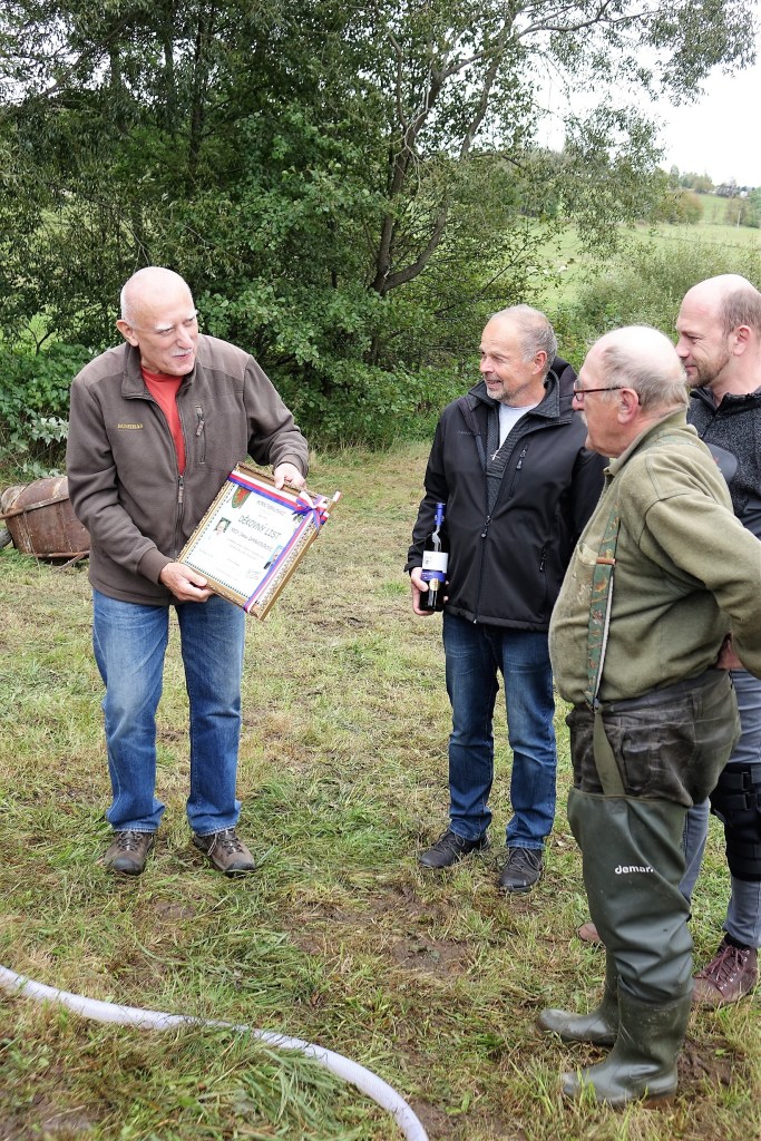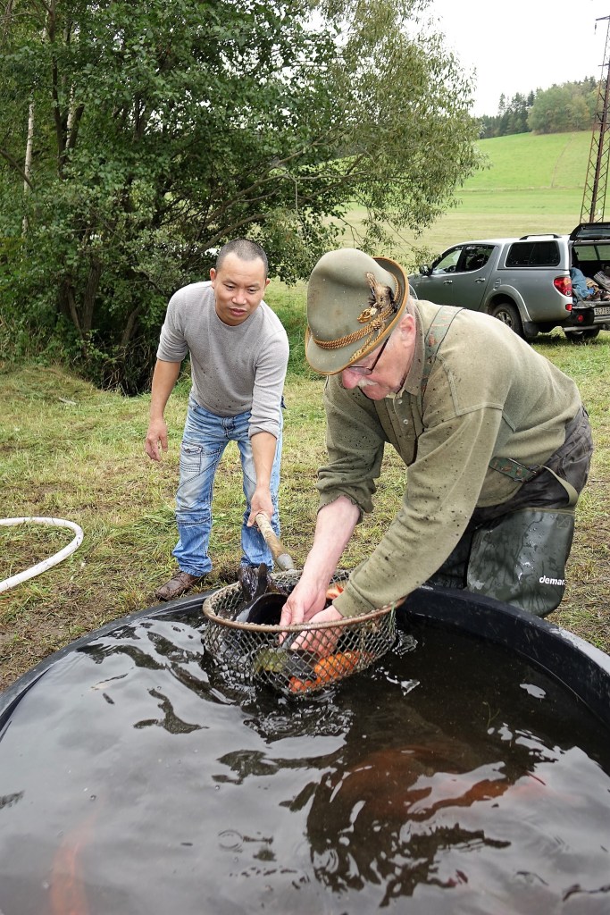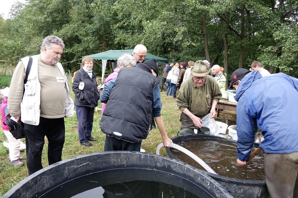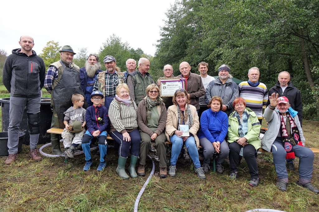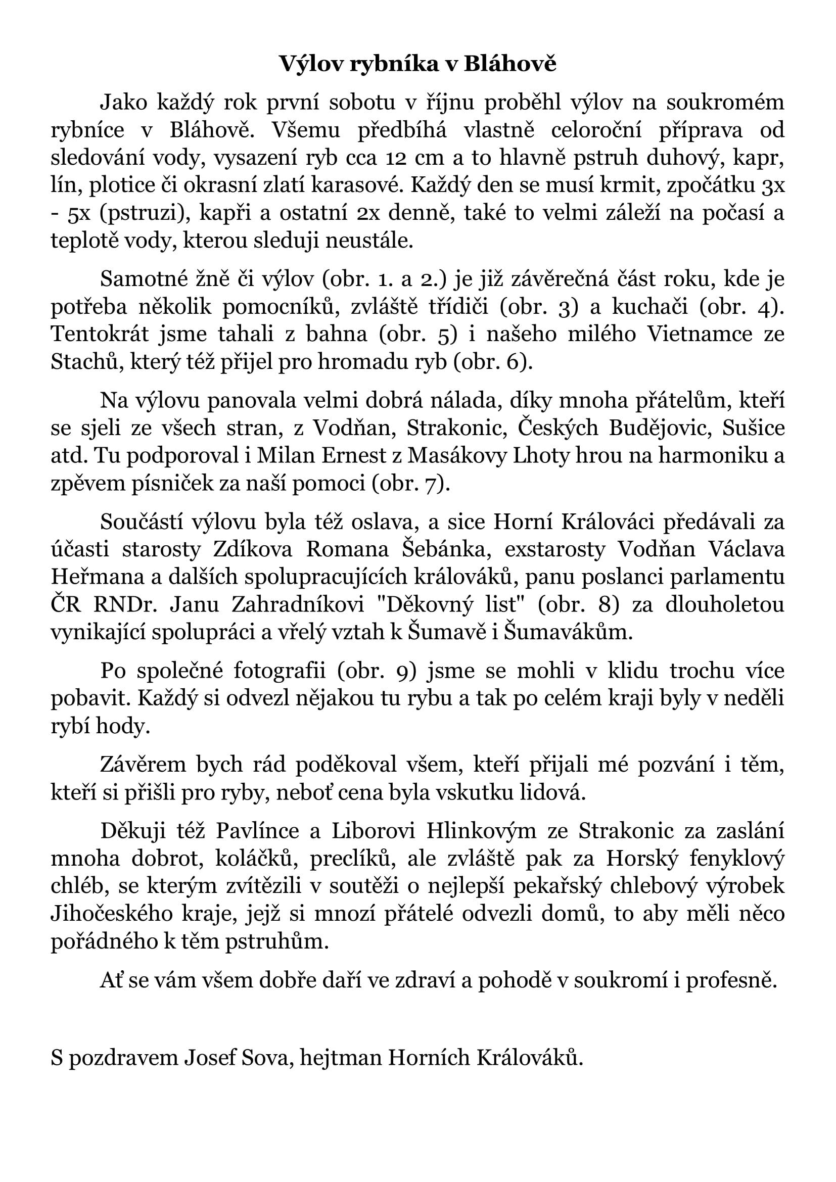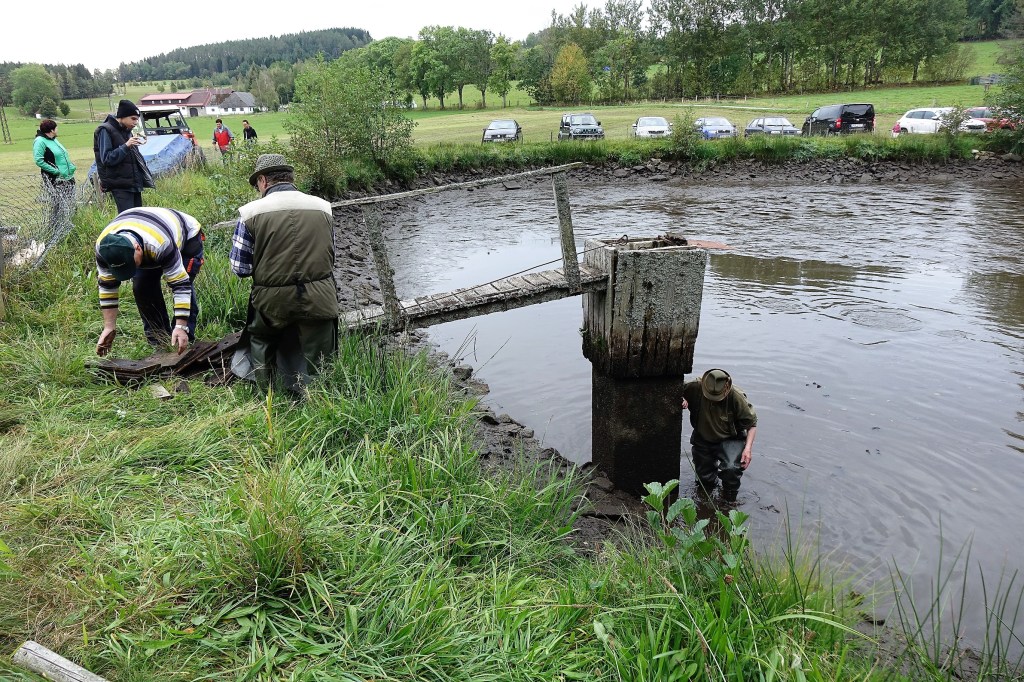 Vypouštění rybníka musí být pozvolnéKrátce před výlovem Třídění rybParta kuchačů, zleva J. Krčmář, V. Heřman, L. Přech a L. Pešl s vnukemZáchrana našeho vietnamského kolegyVýběr ryb dle přáníZmíněný fenyklový chlébPředání děkovného listu panu ZahradníkoviSpolečné foto. Zleva sedící: malý Pešl a Šebánek, paní Heřmanová, Mařenka od Ládi, paní Zahradníková, paní Bucková, paní Lintimerová, Jan Štoural. Zleva stojící: Roman Šebánek, Láďa Přech, pan Pešl, Láďa Pešl, Láďa Lintimer, Vašek Heřman, Josef Sova, Jan Zahradník, Jarda Krčmář, Milan Ernest, Milan Voldřich, pan Bucek.