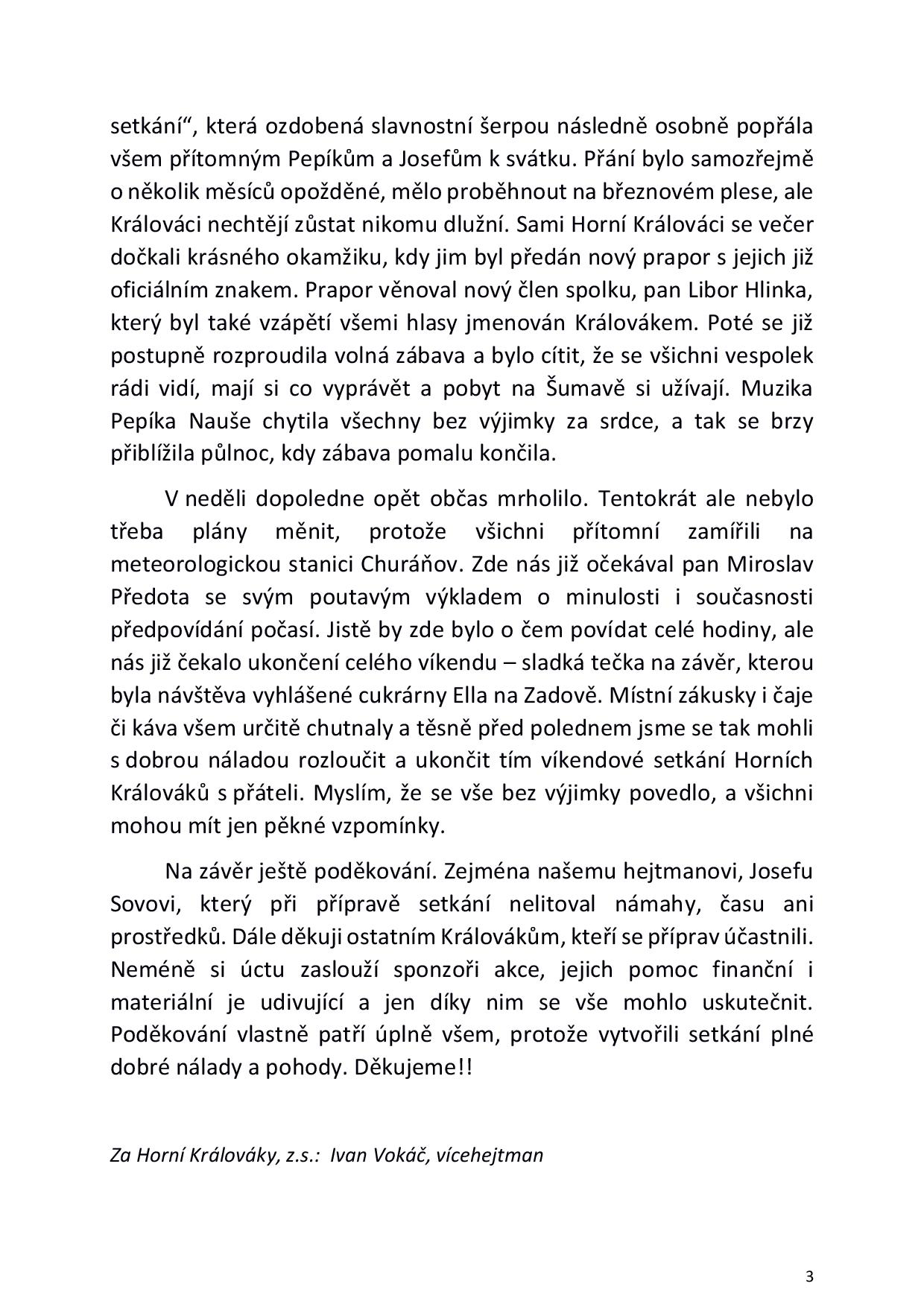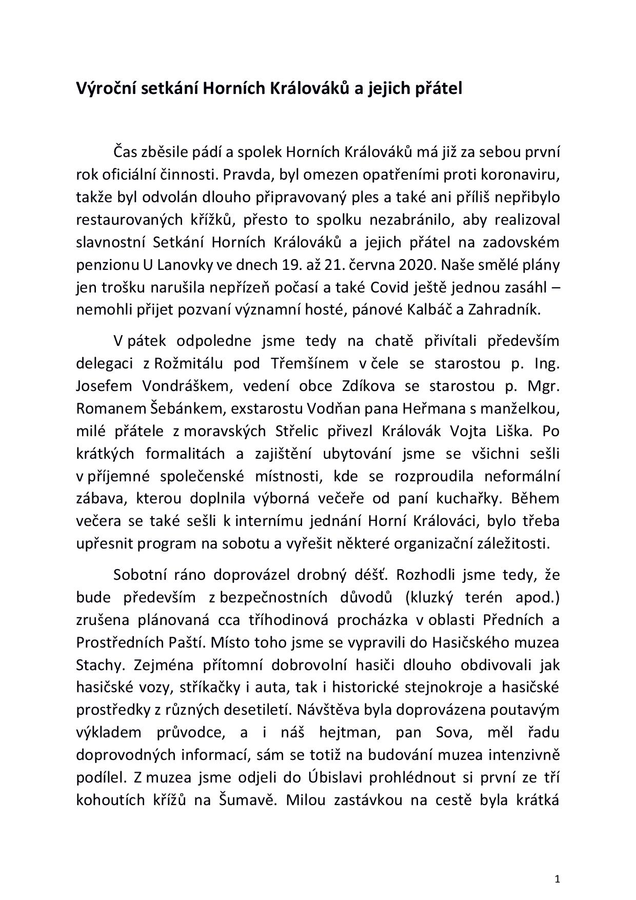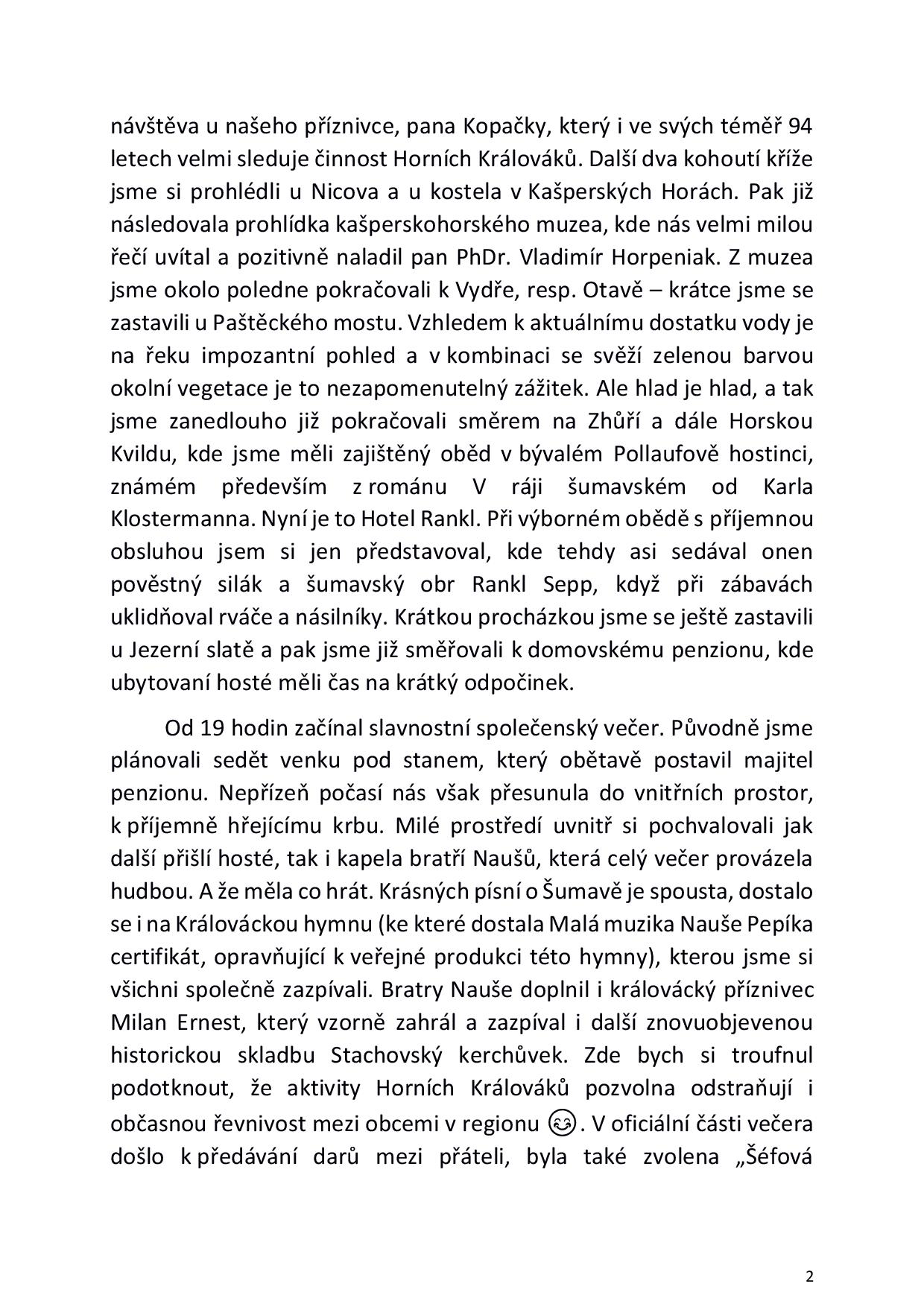 Přivítání hostů z Rožmitálu pod TřemšínemHejtman Horních Králováků Josef Sova a starosta Rožmitálu/T. Ing. Josef VondrášekPřžedání pozornosti k jmeninám paní Květě Svobodové ze StřelicVýprava u kohoutího kříže v ÚbislaviMilé chvíle u manželů KopačkovýchV Nicově u kostelaNa Pašteckém mostěNa Jezerní slatiSobotní večer pomalu začínáPředání praporu Horním KrálovákůmPři zpěvu královácké hymnyDobré jídlo, pití, hudba i zábavaMalá muzika Nauše Pepíka hrála k poslechu i k tanciNa meteorologické stanici v Churáňově